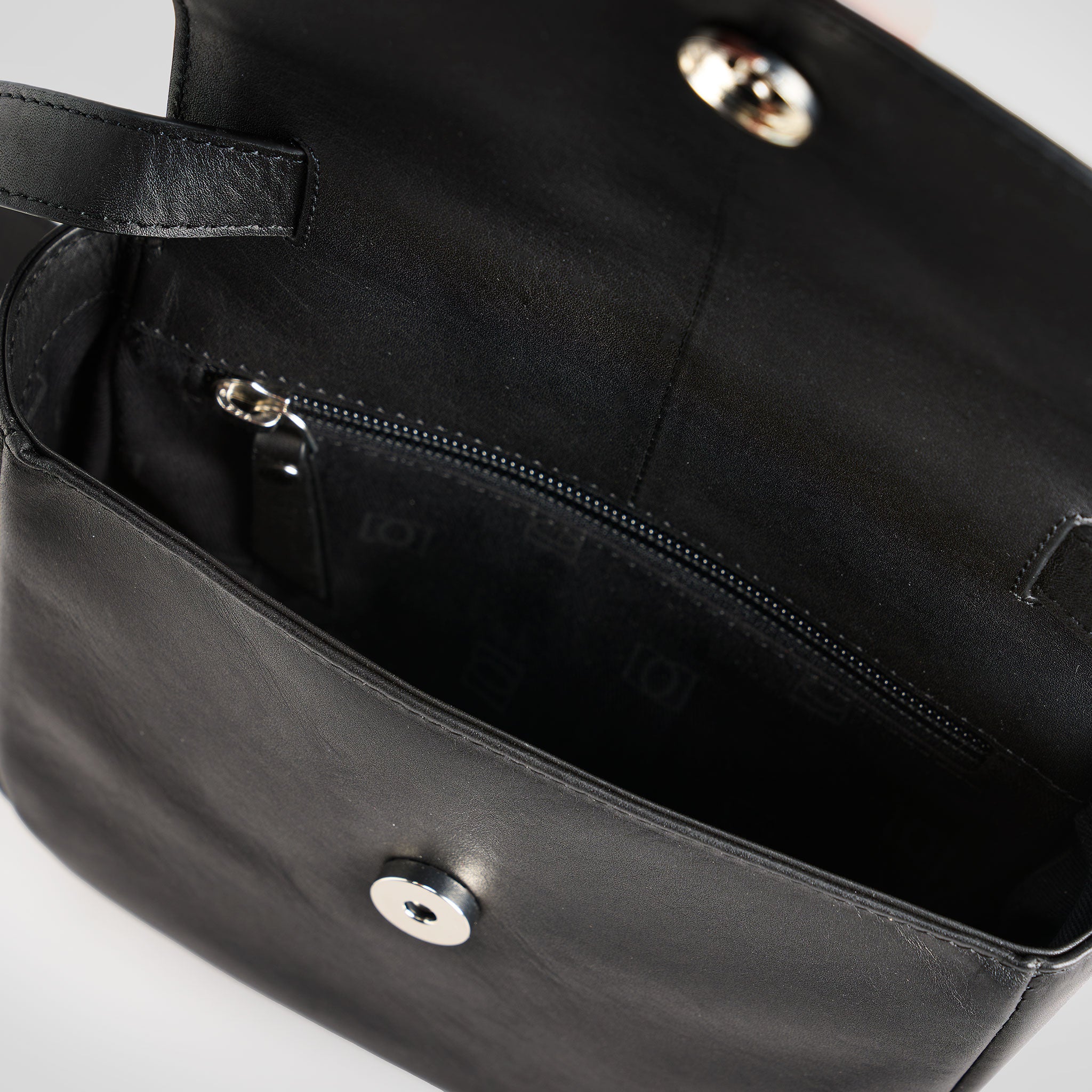 Axelremsväska i svart vegetabiliskt garvat läder i en vacker rund form. Väskan rymmer mobil och plånbok. Justerbar axelrem. Mått: 21x17x6 cm