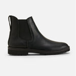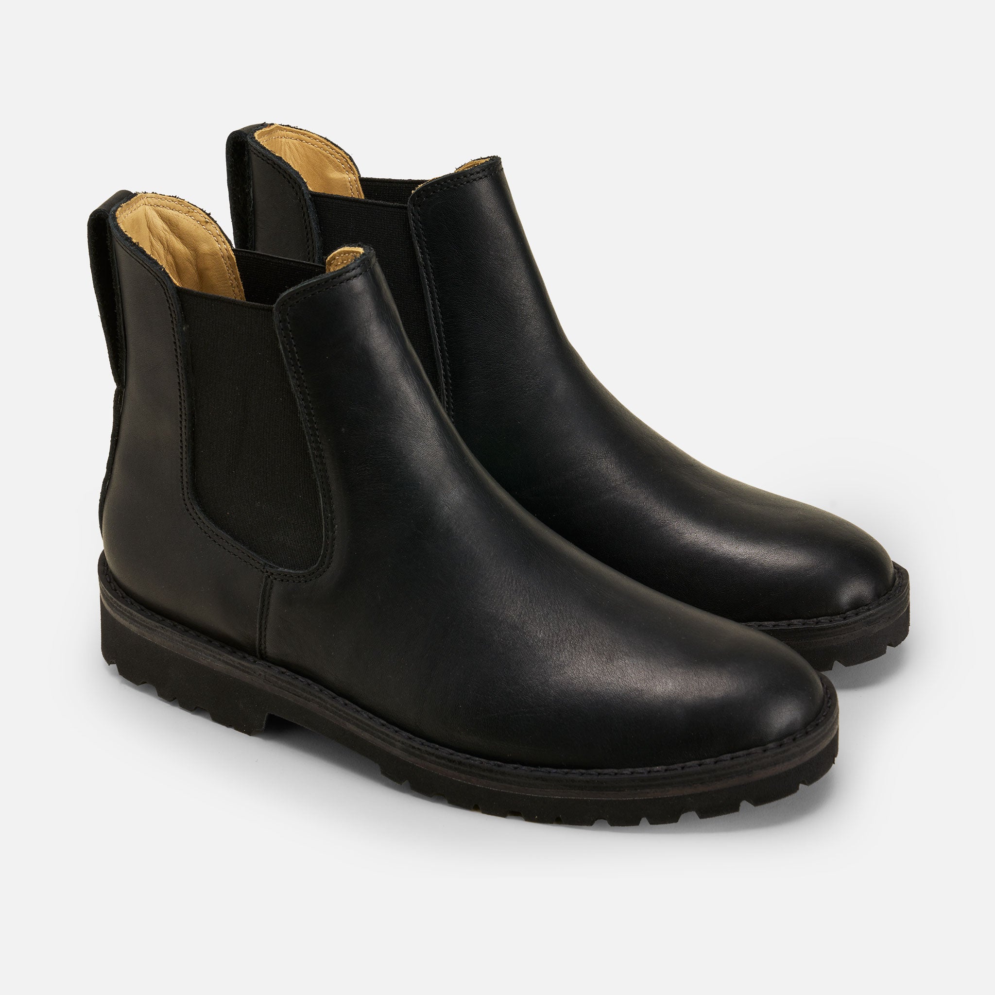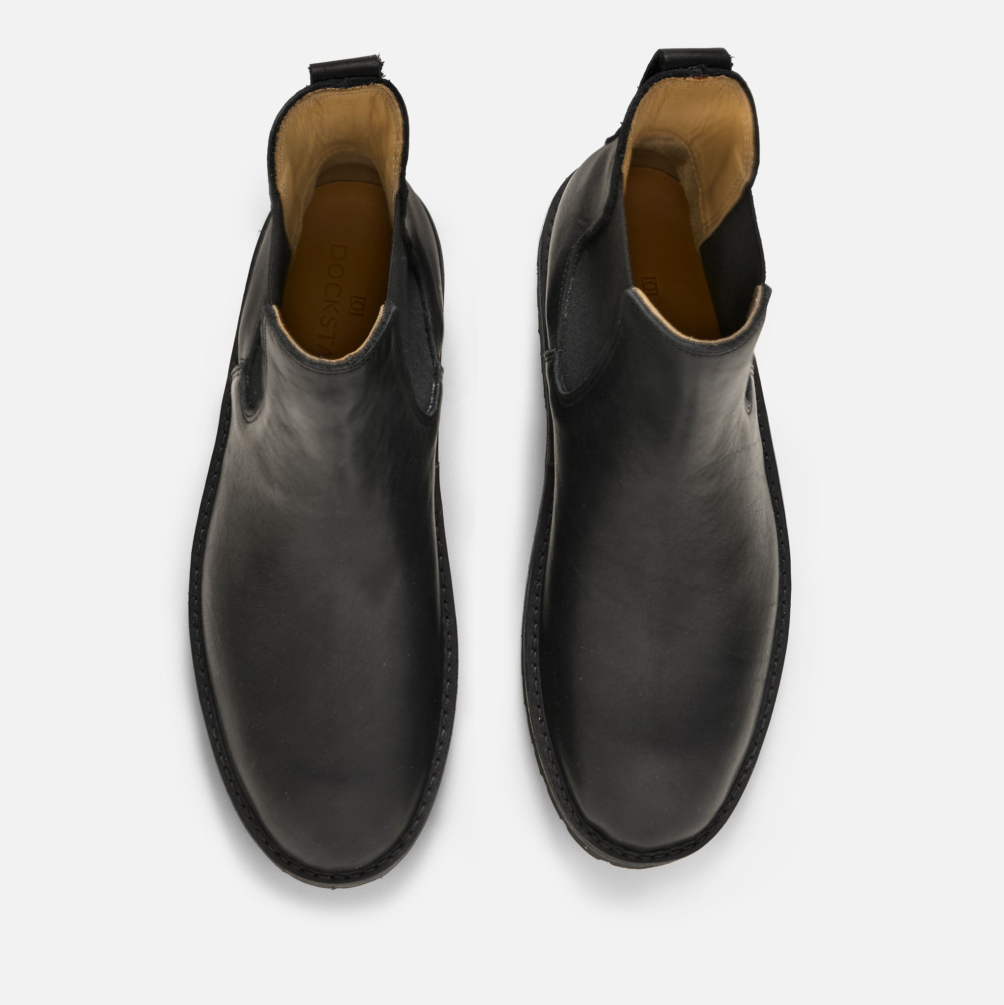 Dockstas Chelsea Boot har en ovandel i svart läder. Lädret är pinnad på en läderbindsula (mellansula) med en stitchdown konstruktion där sömmen har sytts igenom mellansulan för längre hållbarhet.