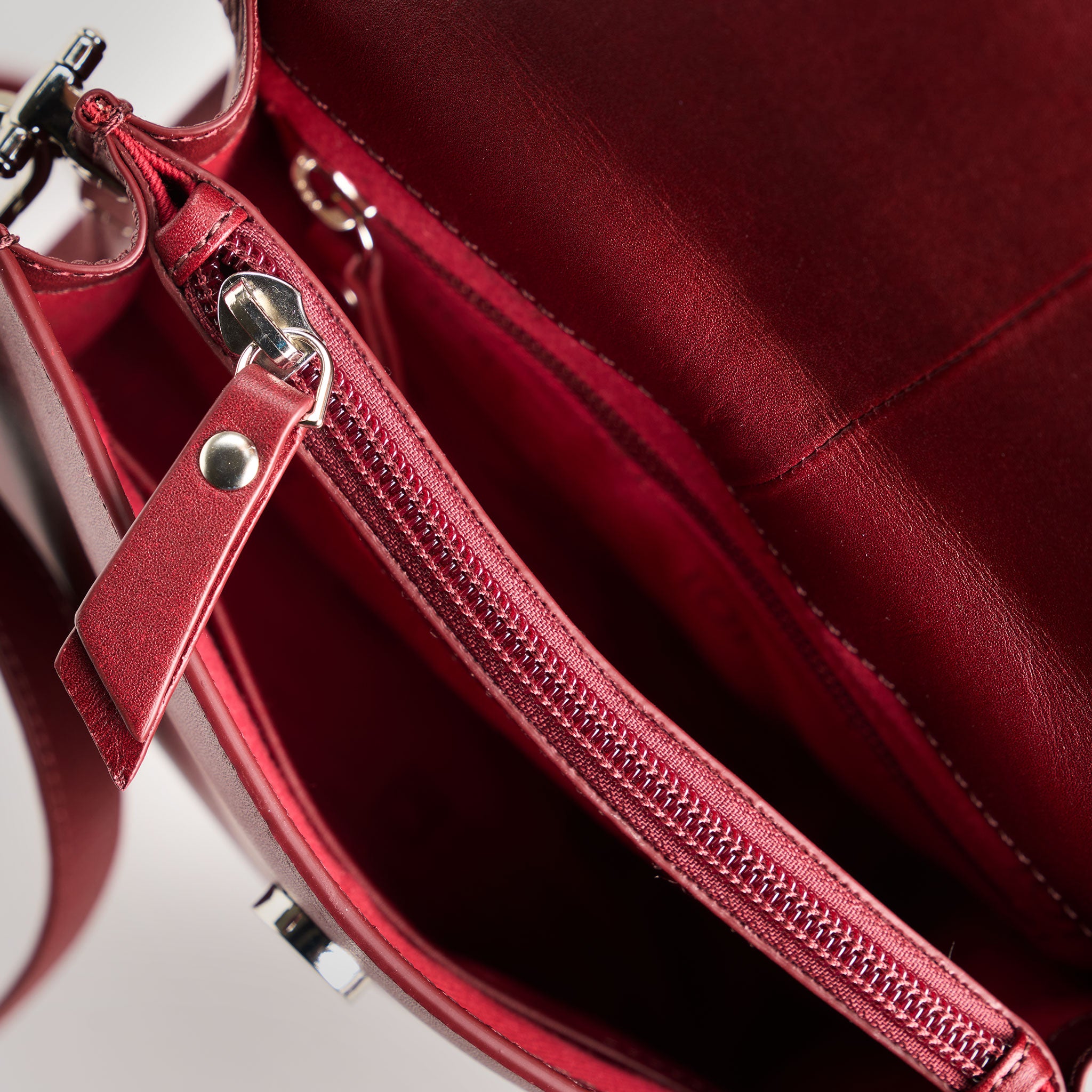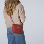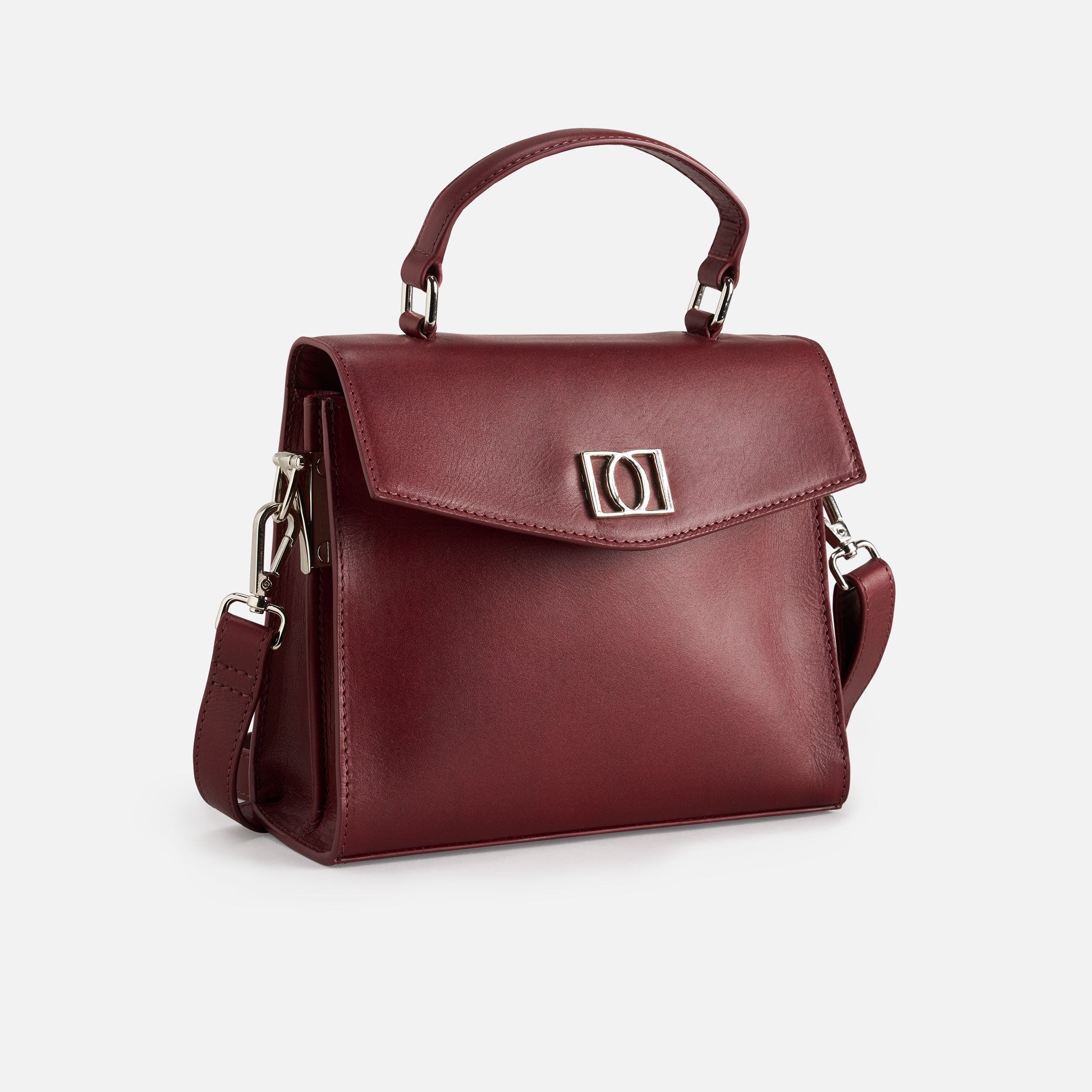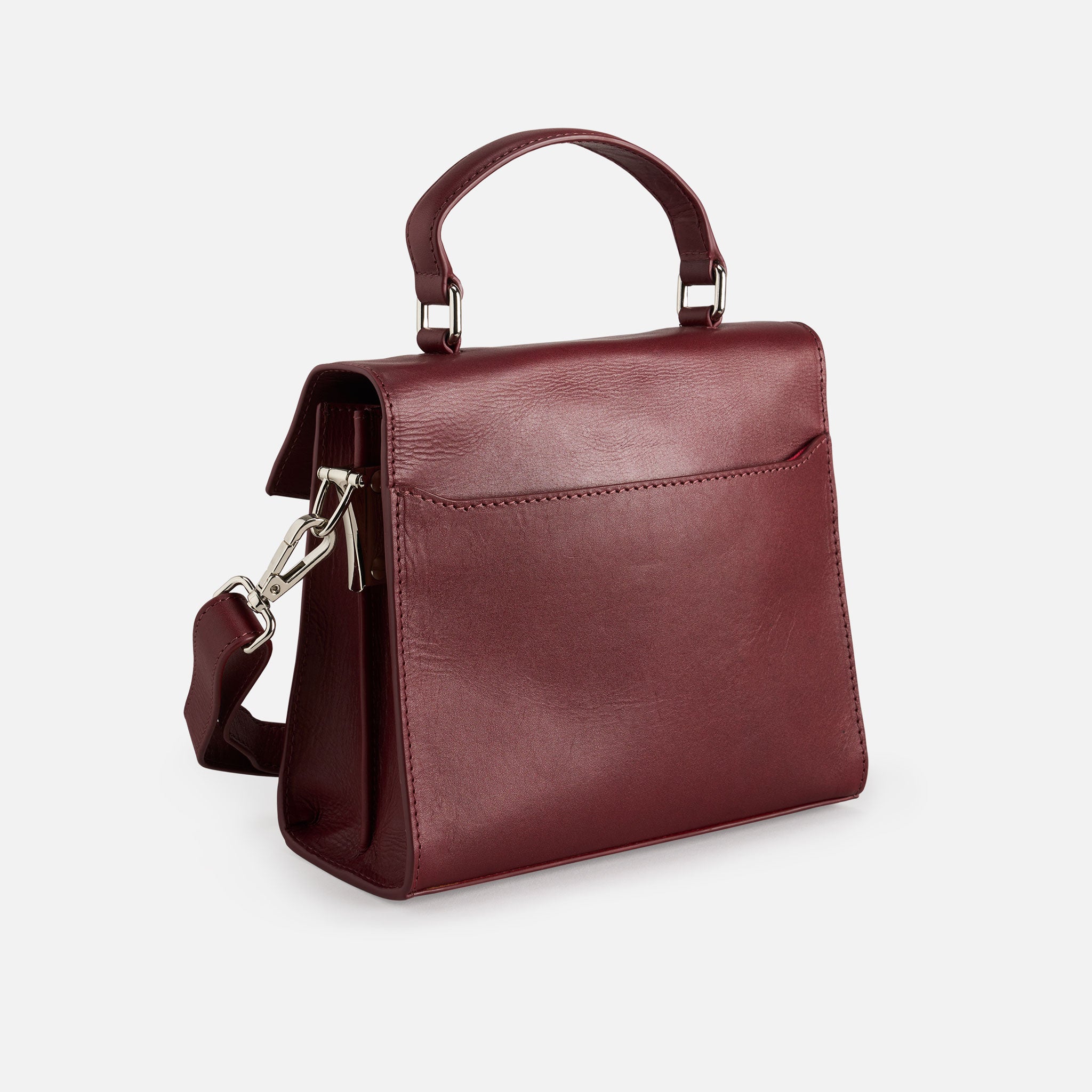 Handväska i burgundy vegetabiliskt garvat läder. Väskan rymmer mobil och plånbok. Justerbar axelrem. Mått: 20 x 17 x 8 cm