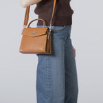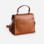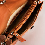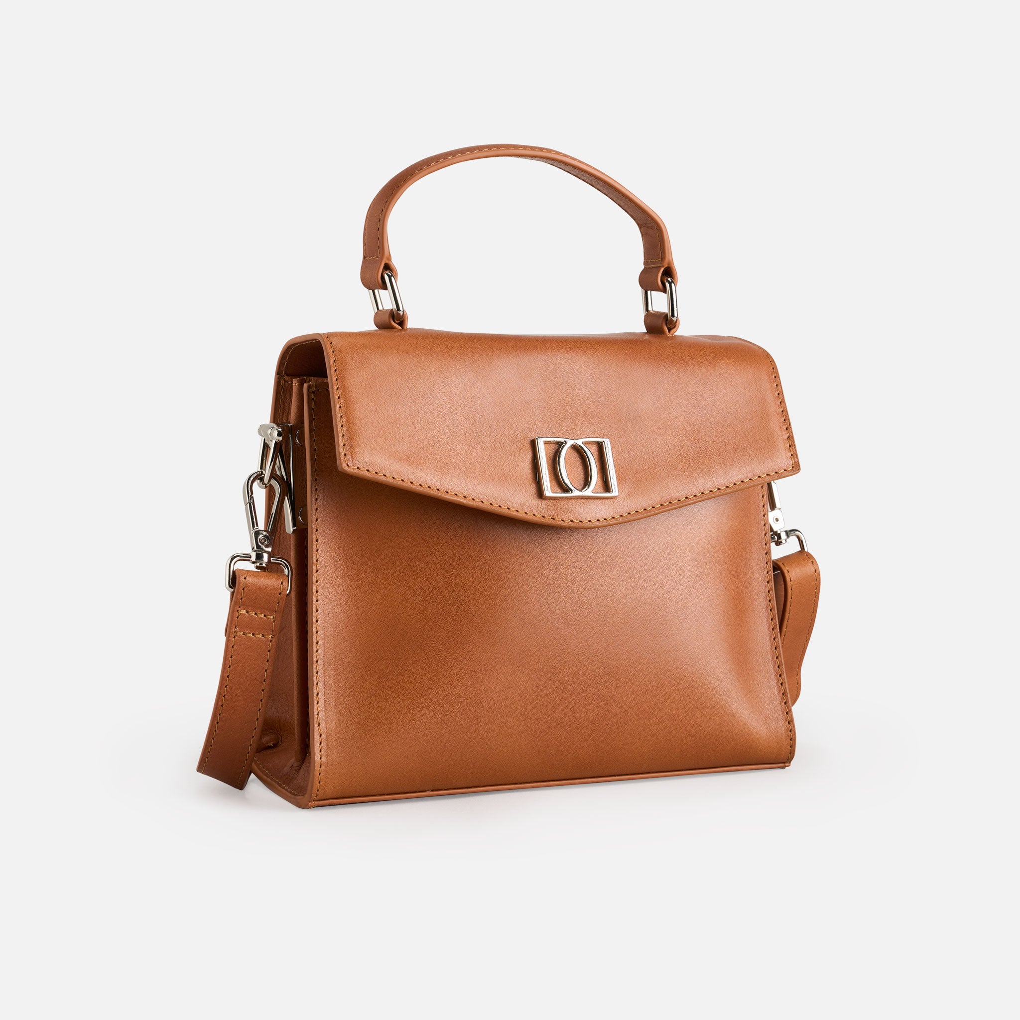 Handväska i natur vegetabiliskt garvat läder. Väskan rymmer mobil och plånbok. Justerbar axelrem. Mått: 20 x 17 x 8 cm