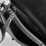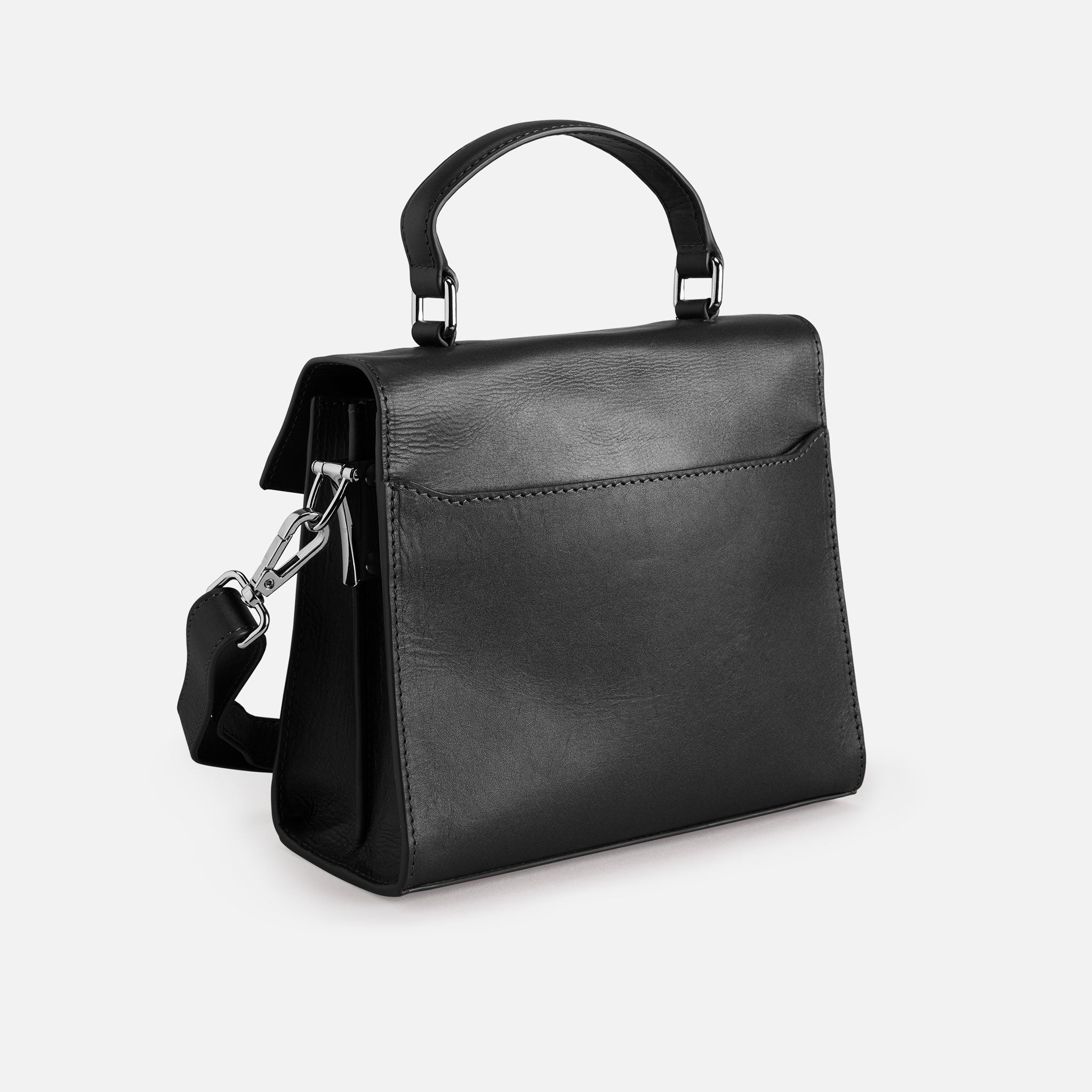 Handväska i svart vegetabiliskt garvat läder. Väskan rymmer mobil och plånbok. Justerbar axelrem. Mått: 20 x 17 x 8 cm