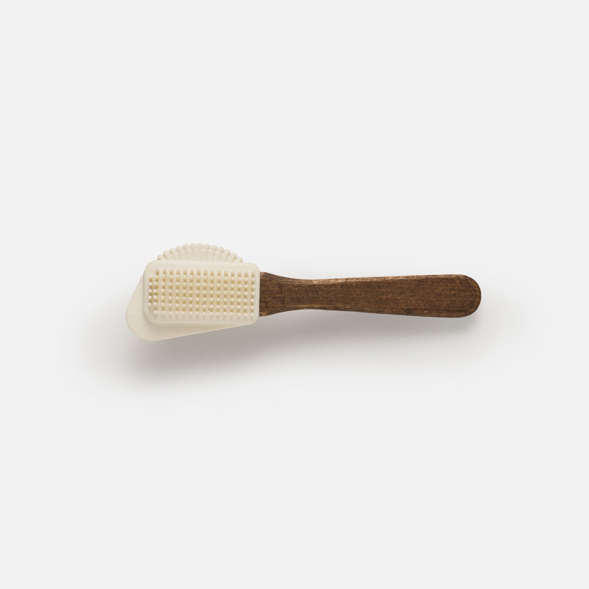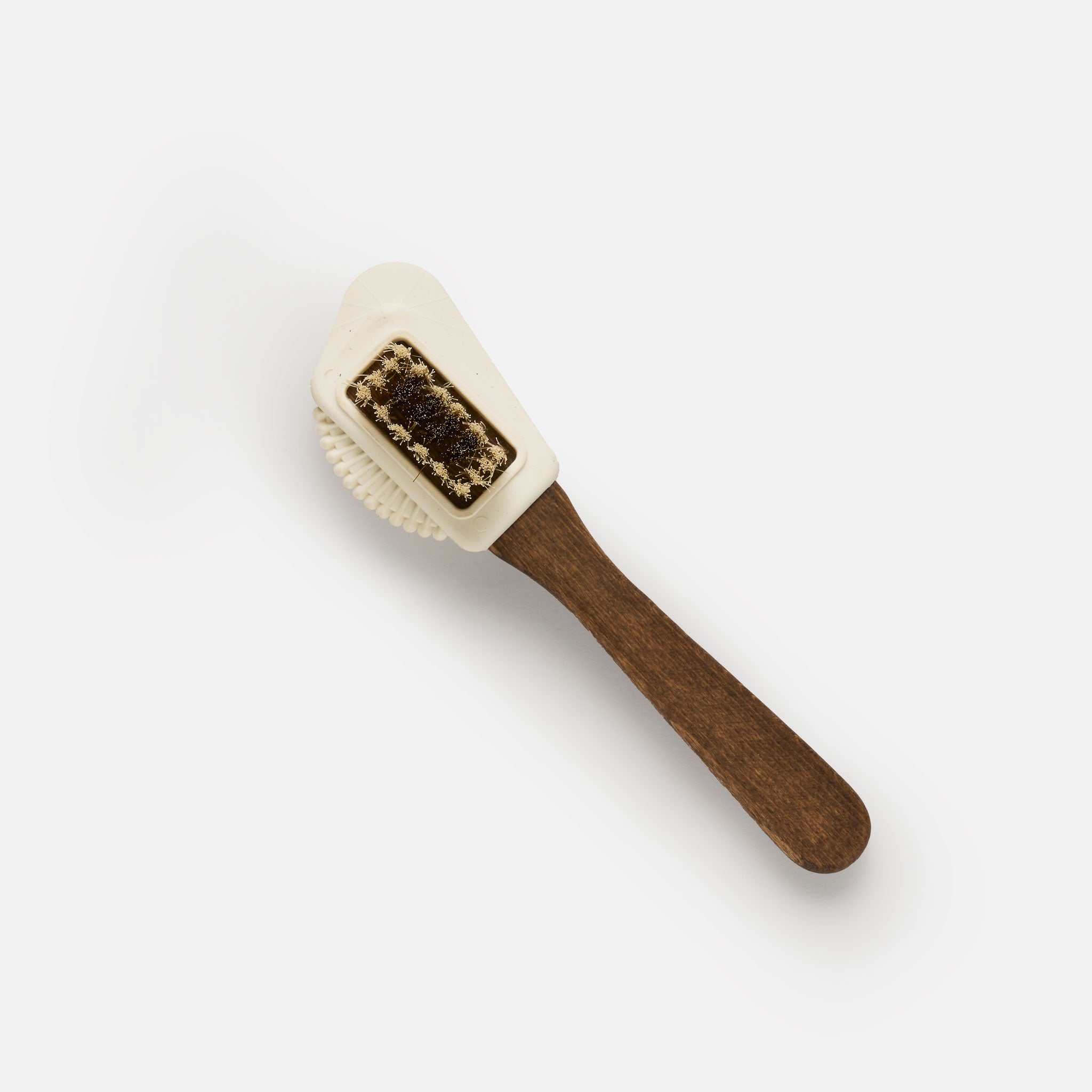 Mockaborsten håller dina skor rena och fina genom att varsamt ta bort smuts och fräscha upp ytan. Kombinationen av gummirader och mässingsborst gör det enkelt att vårda mocka utan att skada materialet.