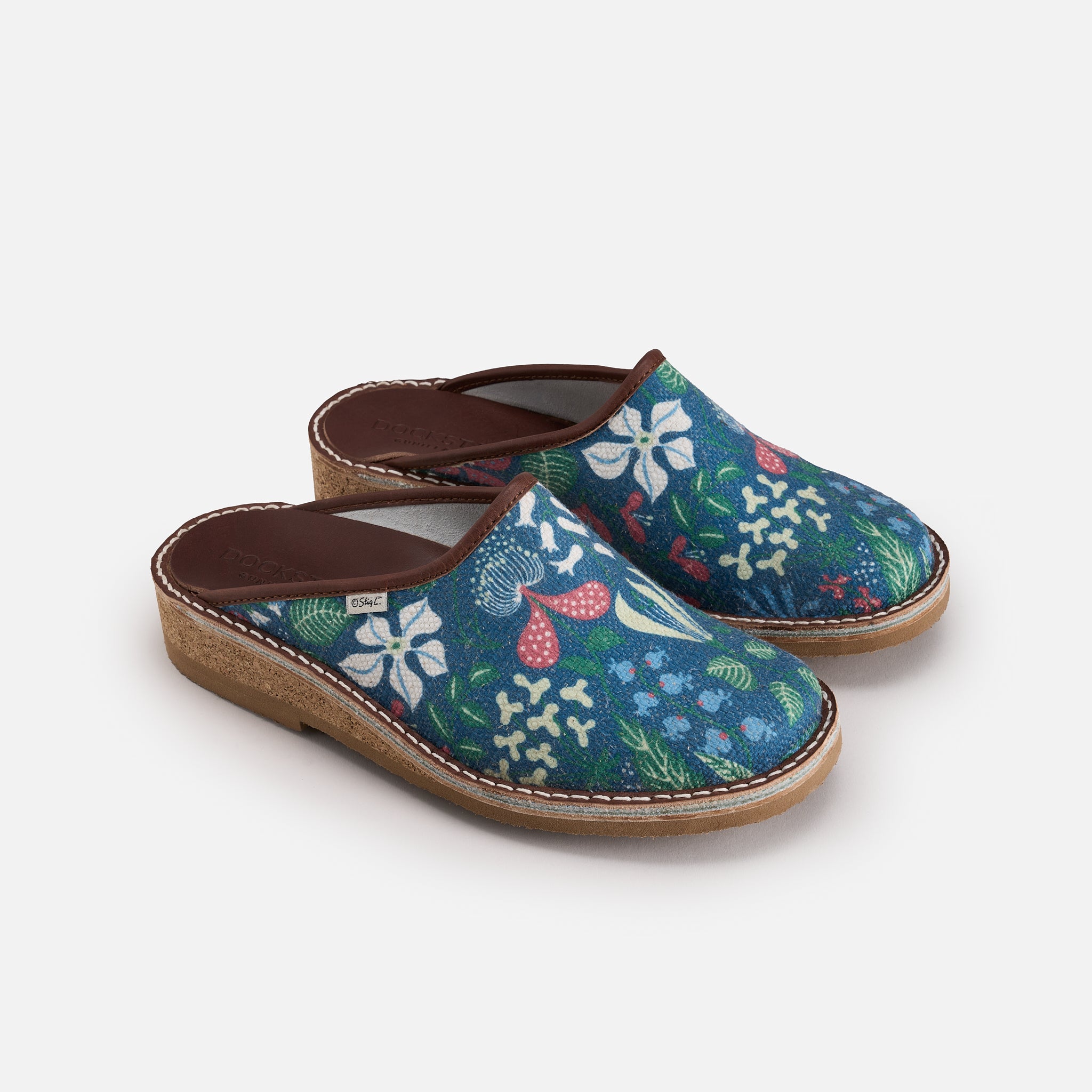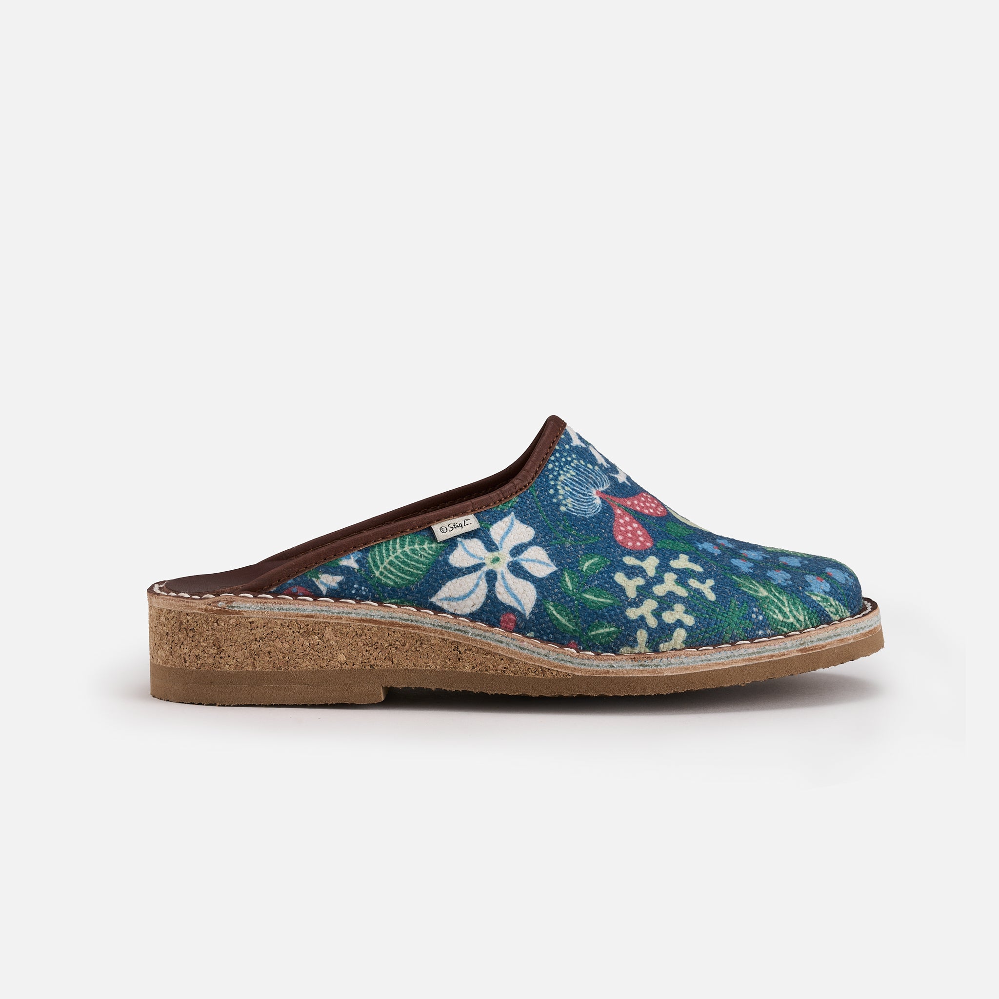 Varje par tillverkas för hand i vår fabrik, där läderhantverket har förfinats i över hundra år. Det mönstrade tyget lamineras mot ett mjukt, högkvalitativt läder som ger en ovandel som både är följsam och stabil. Slippern formar sig efter foten och blir skönare ju mer du använder den.