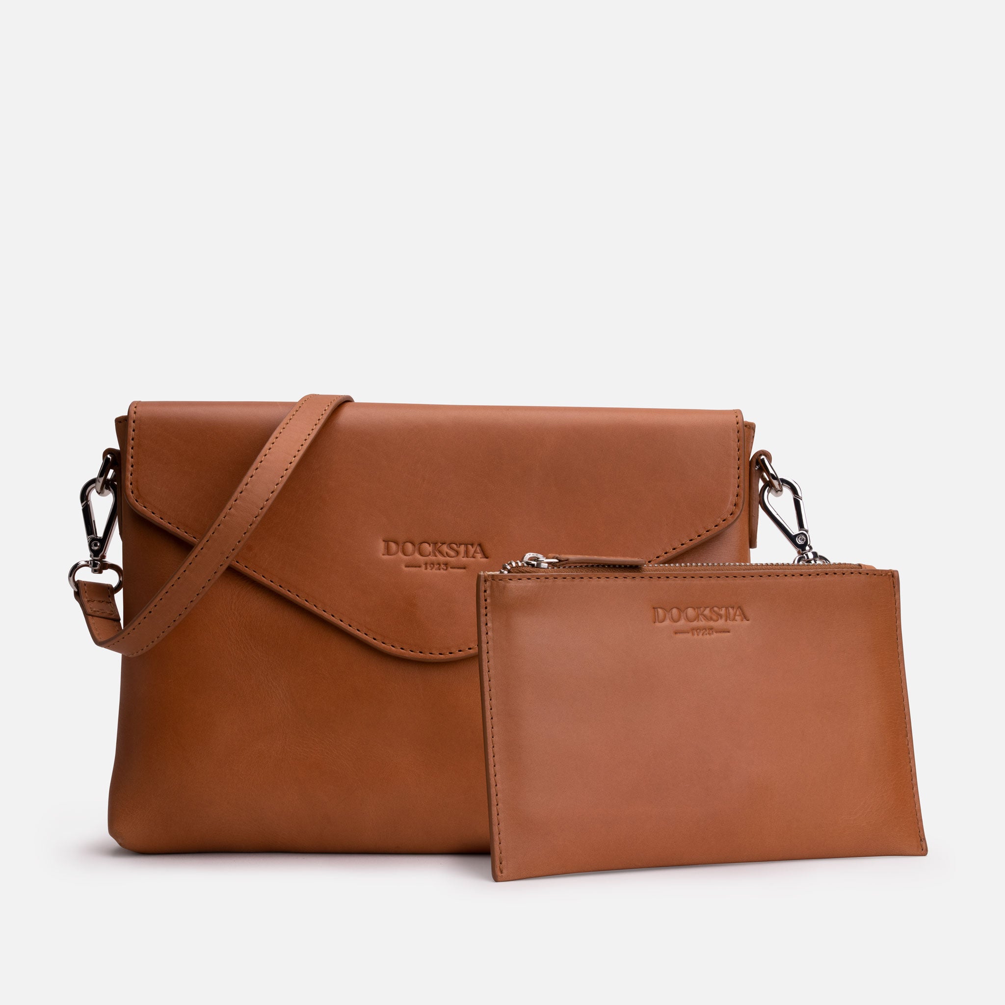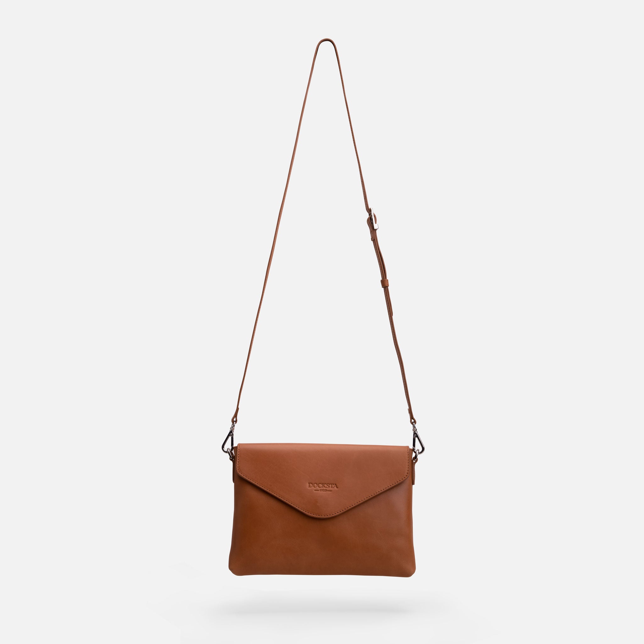 Kuvertväskan Mika med matchande necessär i fint mjukt vegetabiliskt garvat läder.  Axelremmens längd går att justera alternativt tas av. I väskan finns en liten ficka med dragkedja. Locket stängs med en tryckknapp. Storlek: 25x18x4