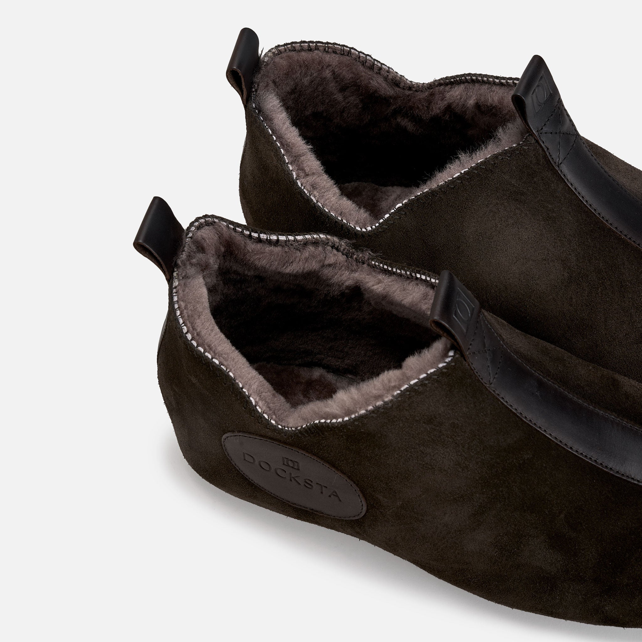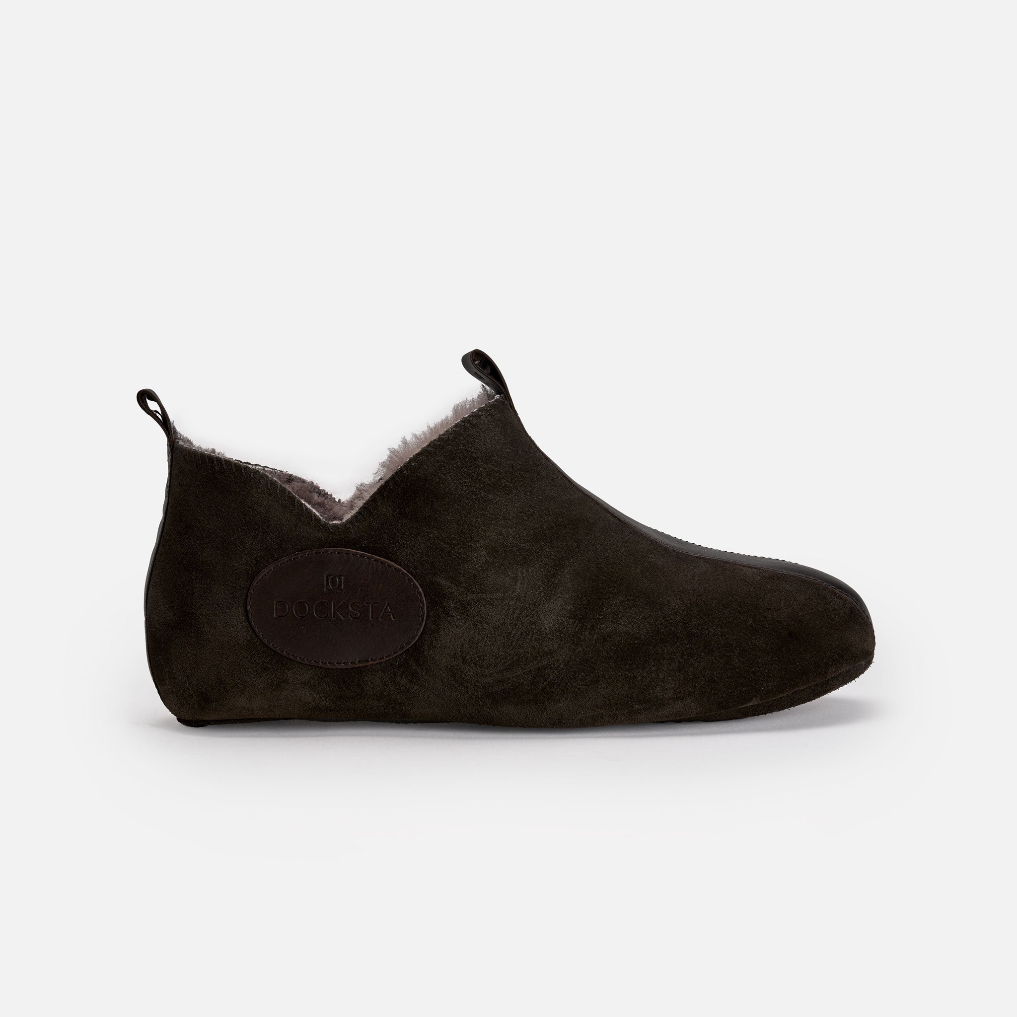 Det som definierar vår mockatoffel är kombinationen av exklusiva naturmaterial. Ovandelen är tillverkad i robust mocka av nöt, ett mer genomarbetat och slitstarkt alternativ än vad som vanligen används i tofflor. Ytan har en matt och len finnish som åldras vackert och ger toffeln karaktär över tid.